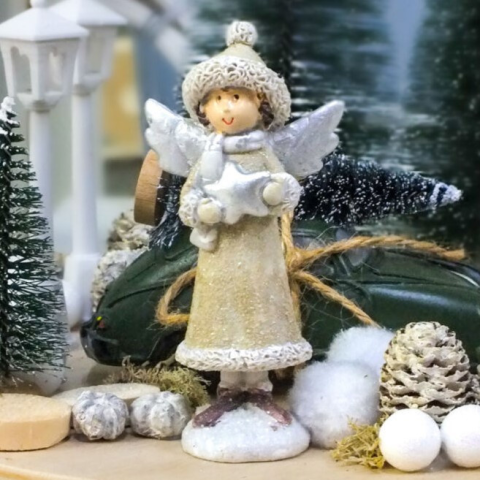 10cm x 5cm Angyal figura sapkában, sállal, pici ajándék csomaggal. Jól mutat önálló díszként és téli dekorációk kiegészítő elemeként egyaránt. Kollégáknak, ismerősöknek kisebb ajándékként is adható.