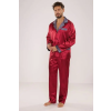 A férfi szaténpizsama borvörös színű. elegáns szabású és hosszú. A férfi szatén luxuspizsama borvörös színű, mintás részletekkel ellátott és percízen kidolgozott. Klasszikus szabású, gelléros és gombos megoldású. A pizsamának mellzsebe és két praktikus oldalsó zsebe is van. A pizsamát összehangolhatja az Adam szaténköntössel. A méret kiválasztásakor, kérjük, kövesse a mérettáblázatot.