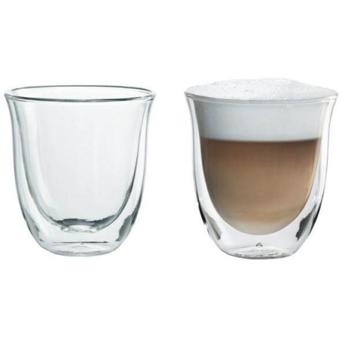 Pohár - rendeltetése cappuccino, alacsony, 2 darab a csomagban, űrtartalma 270 ml, anyaga boroszilikát üveg A kávéscsészék a De'Longhi Cappuccino gyűjteményből kézzel fújt termékek, boroszilikátból készült üveg, és dupla hőálló faluk van. A csészék mosogatógépben moshatók, térfogatuk 270 ml. Előállításukhoz