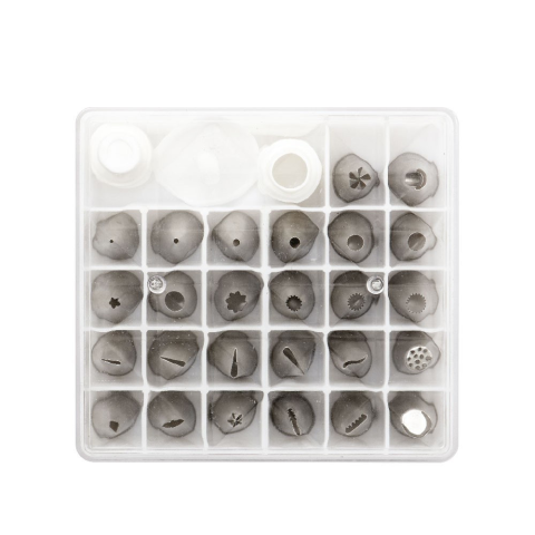Decora díszítőcső készlet, 40db Ez egy olyan díszítőcső készlet, amely elengedhetetlen mindenféle édesség díszítéséhez. A készlet tartalmaz 26 standard díszítőcsövet, 2 praktikus adaptert frissesség megőrző sapkával, 1 virág tűt és egy műanyag szervező