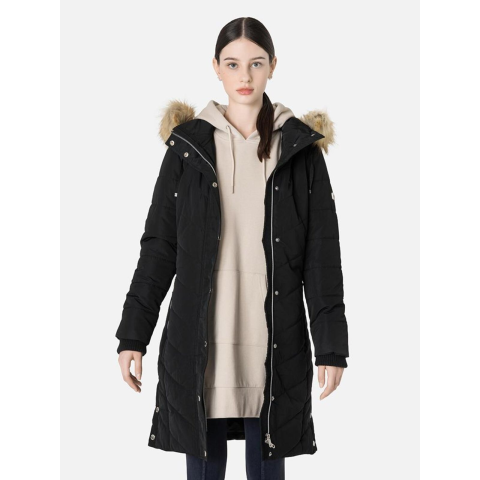Összetétel:PoliészterA NENA karcsúsított pufi télikabát 100% poliészter anyagból készült, stílusos és meleg választás a téli idõszakra. A fényes guminyomatos logó és a bal felkaron található fémnyomat logó modern megjelenést ad, míg a logózott gombok és cipzár tovább emelik a kabát stílusát. A szõrmés kapucni levehetõ, így variálható a kabát viselése, a kötött passzé pedig kényelmes viseletet és extra védelmet biztosít a hideg ellen.