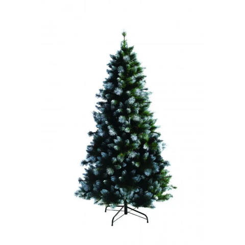 Sötétzöld, havas-tobozos ágain a fényfüzérek, fényhálók, formaizzós- gömbös LED füzérek mutatnak leginkább.