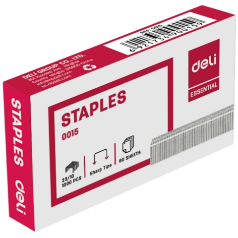 DELI Essential tűzőkapocs: 1000 db éles hegyű kapocs 23/10 méretben Ideális irodai és otthoni használatra egyaránt, ez a DELI Essential tűzőkapocs készlet 1000 db 23/10 méretű, éles hegyű kapcsokkal van ellátva. A 23/10 méretű kapocs 60 lapig képes ö...