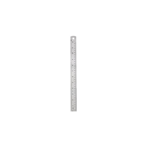 Jól olvasható skála, akasztólyukkal ellátott fém vonalzó. Inch és mm skála. Műanyag tartóban.