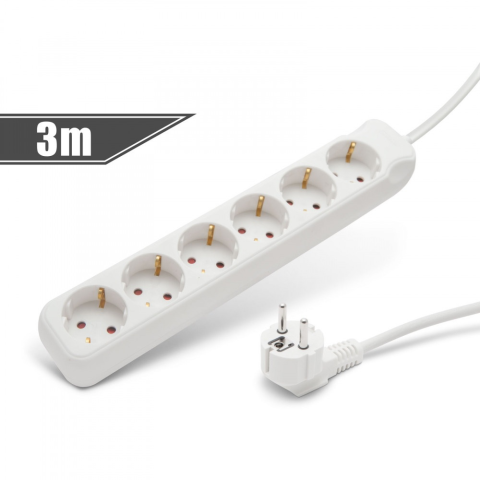 6 utas hálózati elosztó, 3 méteres kábellel. Csatlakozó típusa: CEE 7/7 dugó Aljzatok típusa: 6 db védőérintkezős CEE 7/4 aljzat Max. áramerősség 10/16A Névleges feszültség: 250VAC, 50Hz Vezeték típus: H05VV-F 3x1,5mm2 Vezeték hossz: 3 m Gyerekzárral