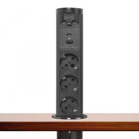 Motorosan süllyeszthető rejtett elosztó irodai és otthoni felhasználásra, fém házzal, 3 db gyermekvédelemmel ellátott hálózati aljzattal, dupla USB töltőegységgel. A legtöbb felületbe és design-ba beleillő kialakítás, függőleges beépítési lehetőség mér
