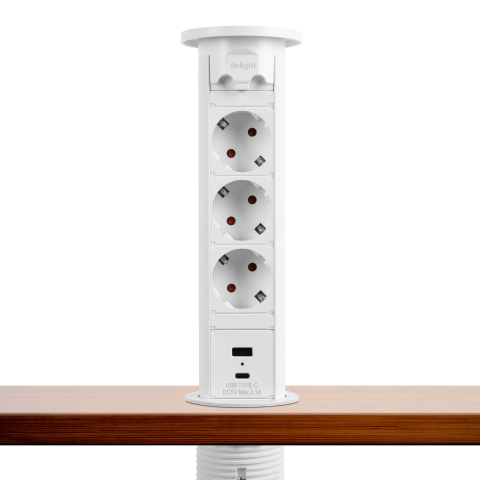 Motorosan süllyeszthető rejtett elosztó irodai és otthoni felhasználásra, fém házzal, 3 db gyermekvédelemmel ellátott hálózati aljzattal, dupla USB töltőegységgel. A legtöbb felületbe és design-ba beleillő kialakítás, függőleges beépítési lehetőség mérsékelten vízhatlan kezelőfelület.