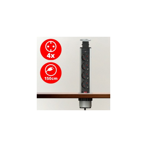 Süllyeszthető 4-es elosztó: bútorlapba, konyhabútorba, munkapultba süllyeszthető hálózati elosztó, gyermekvédelemmel ellátott aljzatokkal. Kis helyet foglal, praktikus, könnyen nyitható. Kiválóan alkalmas ritkán használt konyhai vagy irodai gépek átmeneti áramellátására, illetve előre nem tervezett gépek utólagos beépítéséhez.