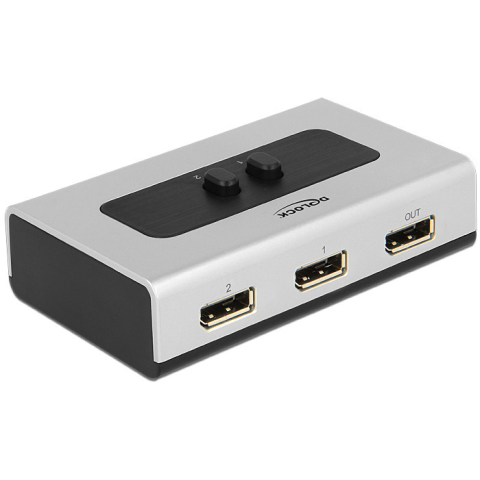 Leírás A Delock Displayport-kapcsoló lehetővé teszi, hogy 2 Displayport eszközt csatlakoztasson egyetlen Displayport-monitorhoz, TV-hez, jelsugárzóhoz stb. A 2 gomb egyike segítségével manuálisan kiválaszthatja, mely számítógép csatlakozhat a Displaypor