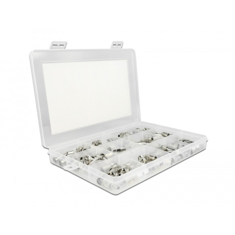 DELOCK 70 darabos krimp doboz 75 Ohm BNC, TNC és F csatlakozókkal
