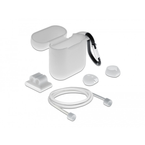 Ez a Delock kiegészítő szett 5 az 1-ben áll, és teljes biztonságot nyújt az Apple fülhallgatói számára. Tartalmaz egy védő dobozt a töltő tartónak, egy kis rögzítő hurkot, két fülhallgató párnát, a rögzítő zsinórokat és egy karabinert. Praktikus védő d