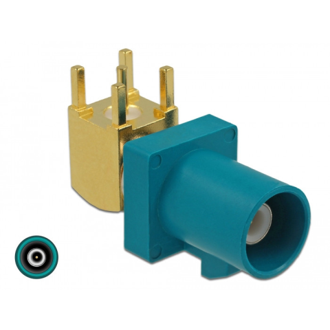 Ez a Delock apa konnektor alkalmas rádió frekvencia technológiájú eszközök összekapcsolására. Műszaki adatok Csatlakozó: 1 x FAKRA Z-dugó 90 PCB FAKRA Z: RAL 5021 vízkék Pin: aranyozott foszfor-bronz Szigetelő: PTFE Borítás: réz-arany