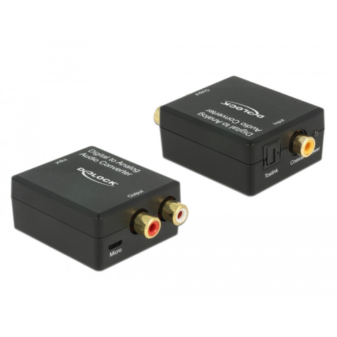 A Delock hangátalakítója egy digitális hangjelet alakít át analóg sztereo jellé. Például egy DVD vagy blu-ray lejátszó köthető az eszköz bemenetébe, és a jel továbbítható egy optikai TOSLINK vagy S/PDIF koax kapcsolaton keresztül. A kimeneti porton az aud