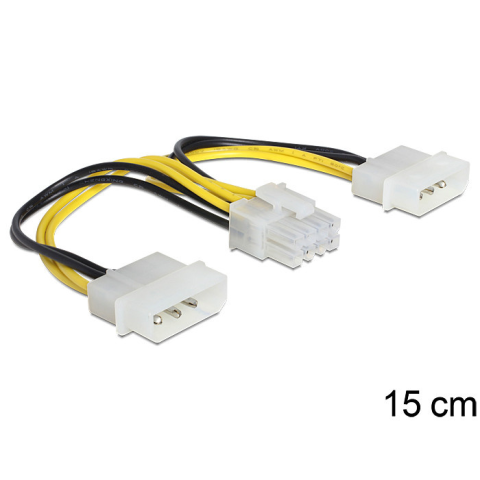 Ez a Delock tápkábel egy olyan alaplap tápellátására használható, melynek 8 tűs EPS (12 V) interfésze 4 tűs Molex anya csatlakozóval felszerelt tápegységhez kapcsolódik. A tápegység nagy energiafogyasztása esetén mindkét Molex csatlakozó összeköthető a tá