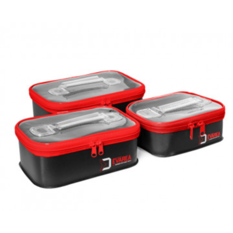 A Delphin EVA szett praktikus három darab szögletes téglalap alakú műanyag táskából áll, különféle horgász felszerelések vagy apró cikkek tárolására. A táskák feketék és piros cipzárral vannak ellátva, amelyek lezárják a fedelét. A fedél átlátszó anyagból készül, amely tökéletes áttekintést nyújt a benne levő dolgokról. A fedél tetején praktikus markolat található. Az alsó rész kemény EVA anyagból készül, ezért könnyen moshatók kívül be