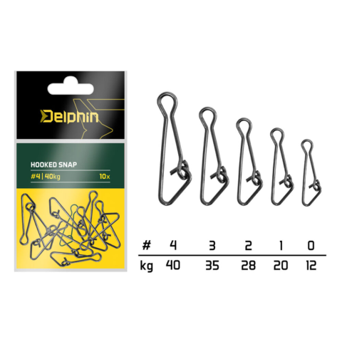 A Delphin Hooked kampós kapocs különféle típusú végszerelékek elkészítéséhez használható. A biztonsági reteszelő mechanizmus lehetővé teszi az olyan alkatrészek gyors és egyszerű cseréjét, mint a műcsali, a ketreces feeder kosár, vagy az ólomsúly. Öt különböző méretben kapható.#4/40kg