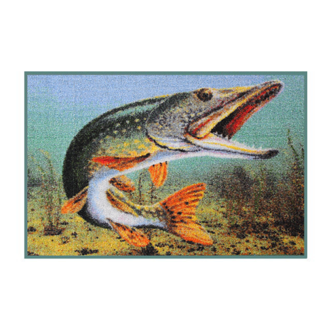 ÖTLETES LÁBTÖRLŐ HORGÁSZOKNAK A vízfelszín alatt úszkáló csuka feltűnő, 3D motívumával díszített szennyfogó szőnyeg. Bizonyára minden horgász megörül neki. A szőnyeg ellenálló anyagból készül, sötétzöld varrású szegéllyel, alsó része latex réteggel kez