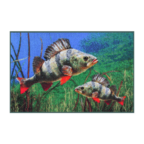 ÖTLETES LÁBTÖRLŐ HORGÁSZOKNAK A vízfelszín alatt úszkáló sügérek feltűnő, 3D motívumával díszített szennyfogó szőnyeg. Bizonyára minden horgász megörül neki. A szőnyeg ellenálló anyagból készül, sötétzöld varrású szegéllyel, alsó része latex réteggel k