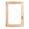 Delta-therm bukó nyíló faablak. Mérete: 90x90cm, balos. Tartozéka: eloxált ablak félkilincs. Szerkezeti vastagság: 68 mm vastag borovi fenyő. Szerkezeti felépítés: 68 mm-es EURO falcos hossztoldott és szélességi toldott rétegragasztott csomómentes BOROVI fenyő. Tömítés: szárnyban körbefutó EPDM alapanyagú zártcellás gumitömítés. Vasalat: GU bronz eloxált vízvető. Üvegezés: 4-16-4 Low-e +Argon Ug=1,1 W/m2K hőszigetelt üveggel. Felületkezelés: nincs.