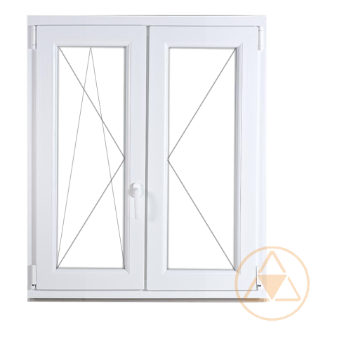Műanyag ablak, középen felnyíló/bukó-nyíló, balos, fehér színben. Mérete: 120x150cm. Szerkezet: 5 légkamrás, 70mm beépítési mélységű, 2,8mm falvastagságú műanyag profil, körbefutó fém merevítéssel, kettős szürke gumitömítéssel. Üvegezés: 4+16+4 Low-e+Argon Ug=1,0 W/m2K, vasalat: Winkhaus résszellőző funkcióval. Tartozéka egy fehér ablak félkilincs.