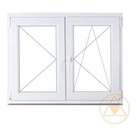 Műanyag ablak, középen felnyíló/bukó-nyíló, jobbos, fehér színű. Mérete: 150x120cm. Szerkezet: 5 légkamrás, 70mm beépítési mélységű, 2,8mm falvastagságú műanyag profil, körbefutó fém merevítéssel, kettős szürke gumitömítéssel. Üvegezés: 4+16+4 Low-e+Argon Ug=1,0 W/m2K, vasalat: Winkhaus résszellőző funkcióval. Tartozéka egy fehér ablak félkilincs.