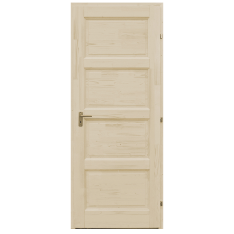 "Zebra beltéri ajtó 4 betétezéssel. Szerkezeti vastagság: 12 cm pallótok, 12 cm-es vagy ennél vastagabb vakolt falba. Szerkezeti felépítés: LAP: 42 mm vastag hossztoldott, táblásított lucfenyő, ellenprofilos kialakítással. TOK: 12 cm vastag natúr hossztoldott lucfenyő pallótok. Tömités nélkül. Fabetétes. Felületkezeletlen." Tartozékok: zár, zárbetét, kulcs. Kilincs nélkül értékesítjük!