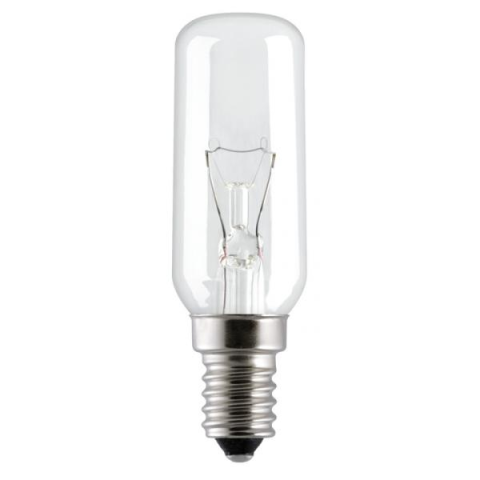 Páraelszívó berendezések izzója. Méret: 85x25mm Sugárzási szög: 360 fok Foglalat: E14 Teljesítmény: 40W Feszültség: 220-240V Frekvencia: 50Hz Anyaga: Üveg Színhőmérséklet: 2800K Élettartam: 1000 h Fényáram: 300 lm Energiaosztály: E Súlyozott energiafelhas