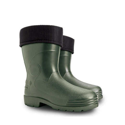 4 pár/karton Rövid szárú pehelykönnyű EVA csizma zöld színben, kivehető - mosható béléssel, hőszigetelő hatás akár -30 °C-ig. Nagyon kényelmes és ideális választás a hideg, csapadékos napokra.