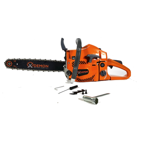 Láncfűrész DEMON 2200W CS-58TNagyon könnyen irányítható láncfűrész univerzális felhasználással. Láncfékkel rendelkezik, ami visszarúgás esetén azonnal leállítja a láncot. Automatikus lánckenéssel rendelkezik.Technikai paraméterek:Leadott teljesítmény: 2,2 kwFűrészlap és lánc hossza: 38 cmÜzemanyag ólommentes benzin + olajAutomatikus lánckenésSúly: 6,50 kgÜresjárati fordulatszám: 2800Motor maximális fordulatszáma: 8500Üzemanyagtartály térfogata: 550 mlOl