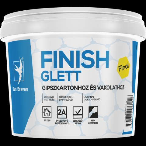 A Finish GLETT gipszkartonhoz és vakolathoz előre kevert paszta állagú termék, kiváló tapadószilárdsággal az aljzaton és levegőn száradó kiváló plaszticitással, alacsony szemcsetartalommal, repedésekkel szembeni nagyfokú ellenállóképességgel, mely gipszkarton lapok, falak és mennyezetek befejező kittelésére és fugázására szolgál. Alkalmazási terület: Kizárólag beltéri használatra, a falak egyenetlenségeinek kiegyenlítésére, régi és megrepedezett vakola