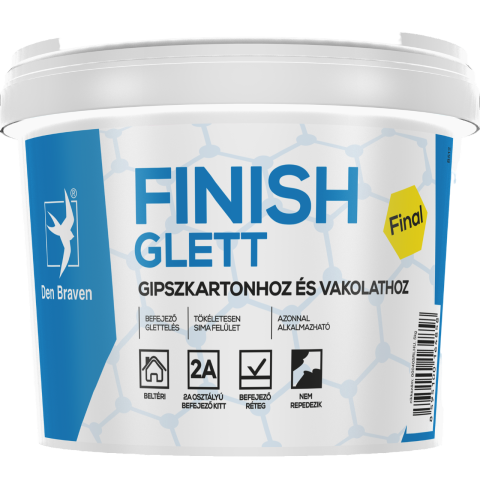 A Finish GLETT gipszkartonhoz és vakolathoz előre kevert paszta állagú termék, kiváló tapadószilárdsággal az aljzaton és levegőn száradó kiváló plaszticitással, alacsony szemcsetartalommal, repedésekkel szembeni nagyfokú ellenállóképességgel, mely gipszkarton lapok, falak és mennyezetek befejező kittelésére és fugázására szolgál. Alkalmazási terület: Kizárólag beltéri használatra, a falak egyenetlenségeinek kiegyenlítésére, régi és megrepedezett vakola