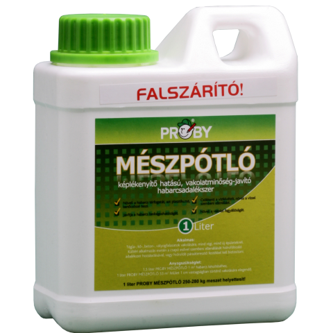Proby mészpótló - 1 l - képlékenyítő hatású, vakolatminőség-javító habarcsadalékszer - tégla-, kő-, beton-, vályogfalazatok vakolására - növeli a habarcs térfogatát, plasztikussá, kenőcsössé teszi - javítja a habarcs bedolgozását - csökkenti a vízfelvételt, növeli a vízzel szembeni ellenállást - növeli a vakolat fagyállóságát - kültéri alkalmazás esetén a csapó esővel szembeni védelmet hidrofóbizáló adalékszer hozzáadásával, vagy hidrofób p