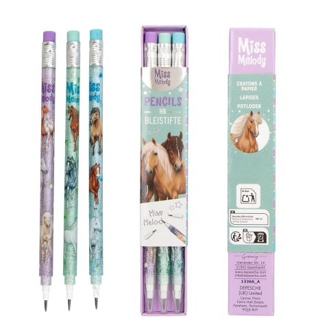 A Miss Melody remek színekben pompázó tolóbetétes ceruzái gyönyörű lómotívumokkal, csillámokkal és színben passzoló radírfedőkkel. Használata egyszerű: húzzuk ki az elkopott hegyet, majd távolítsuk el a radírt, és toljuk vissza a régi hegyet a ceruza felső részébe, így ez kinyomja a következő új hegyet alul. Három ceruza tartozik egy készletbe.
