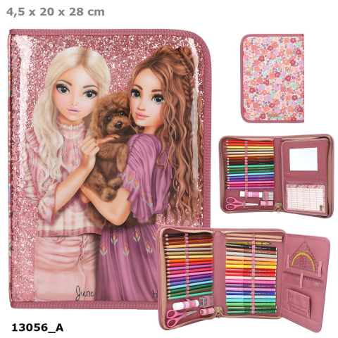 A tolltartó nagy, A/4-es méretű, egy emeletes. Tartalmaz 18 színesceruzát és 18 filctollat, 2 ceruzát, radírt hegyezőt, vonalzót, ollót, ragasztó-stiftet és egy kis tükröt . Fő anyaga 100% poliészter; elülső anyag 100% PVC
