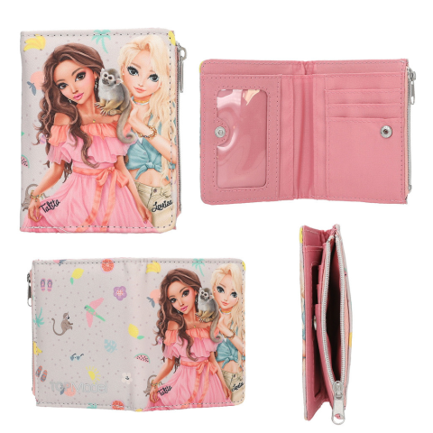A TOPModel Juicy pénztárca nagy dupla modellmotívummal, egy majommal, és vidám kis pöttyökkel, virágokkal, gyümölcsökkel, majmokkal, madarakkal, pálmafákkal és nyári kiegészítőkkel van díszítve. A pénztárca belseje rózsaszín. Patenttal záródik, van benne bankjegyrekesz, cipzáras érmerekesz, átlátszó ablakos rekesz és egyéb (kártya) rekesz. Anyaga: 100% poliészter.