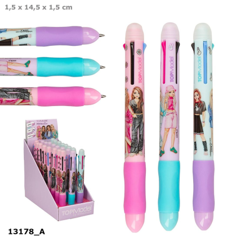 TOPModel törölhető 4 színű zselés toll. Egyszerűen dörzsölje át a toll kerek műanyag hegyét, azon amit írt, és az írás máris eltűnik. Ennek a tollnak négy különböző színű tollbetéte van, amelyeket külön-külön is lecsúsztathatsz (rózsaszín, fekete, sötétkék, világoskék). Három tolldizájn érhető el: rózsaszín toll -rózsaszín gumival, lila toll - türkiz gumival, és világoskék toll - lila gumival.