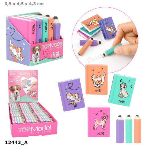 Iskolai könyvek és ceruzák mini formátumban: A TOPModel aranyos radírkészlete vidám színekben és aranyos kutyamotívumokkal egy kis csomagba csomagolva, amelyben a 7 radír tökéletesen elfér.