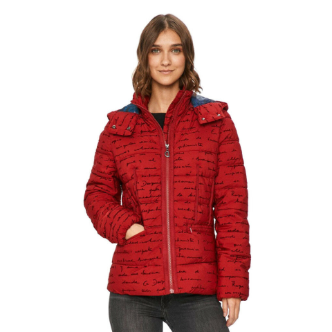 Desigual Natasha piros női téli dzseki - Stílus és kényelem a hideg napokra! ❄️ Ez a piros Desigual téli dzseki tökéletes választás, ha egyedi és divatos megjelenésre vágysz a hideg időben is. A felirat mintás design kiemel a tömegből, miközben a könn...