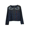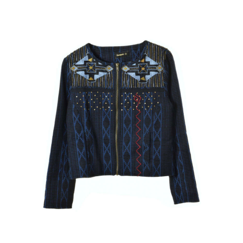 Desigual Sötétkék Női Cipzáros Felső - Etnó Mintás, Gyöngyös Díszítéssel ✨ Ez a Desigual sötétkék felső egyedi stílust és kényelmet kínál. A fekete etnó minták, a csillogó gyöngyök és flitterek elegáns és figyelemfelkeltő megjelenést biztosítanak....