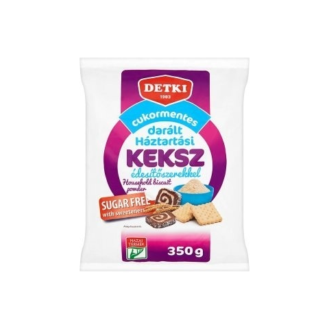 Cukormentes darált háztartási keksz édesítőszerekkel. 350 g-os darált háztartási keksz; Detki termék a cukormentes kekszek kedvelőinek.