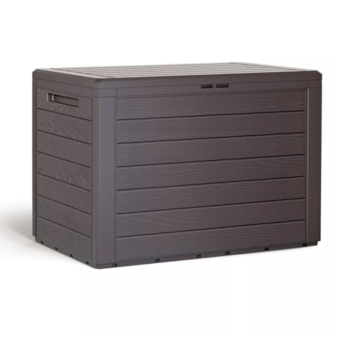 Modern tárhely: A műanyagból készült, fa megjelenésű Lille párnadoboz helyet kínál ülőpárnák, párnák és egyéb kerti kiegészítők számára. A csuklós fedél zárszerkezettel könnyen nyitható és zárható. A doboz oldalán süllyesztett fogantyúkkal is fel van sze