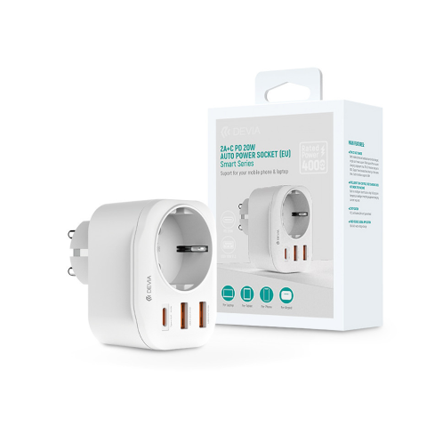 Információk Devia hálózati csatlakozóaljzat 2xUSB-A + Type-C PD kimenettel - Devia Smart Series 2A+C PD 20W Auto Power Socket - fehér