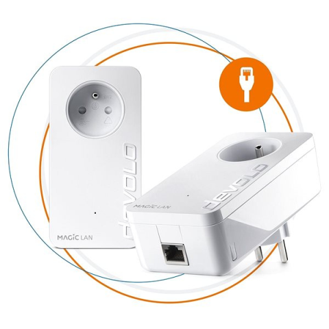 Powerline adapter - eszköz adatátviteli sebessége 2400 Mb/s és hatótávolsága 500 m, elsődleges egység átmenő aljzat, 10/100/1000 Mb/s LAN sebesség és 1 LAN port, IEEE 802,3, IEEE 802,3x, IEEE 802,3u, IEEE 802,3ab , IEEE 802,3az, HomeGrid Forum és IEEE 802,1p protokollok és szabványok, 128-bit AES titkosítás, plug and play és LED jelző A Powerline Devolo Magic 2 LAN egyet jelent a fantasztikusan gyors, fantasztikusan rugalmas és hibátlanul működő internetkapcsolattal. A