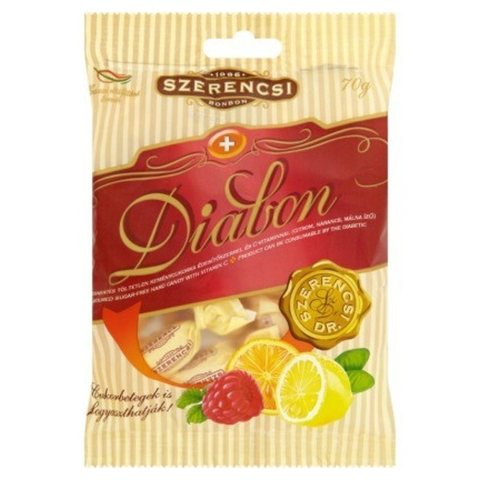 Diabon cukorka citrom narancs málna 70 g Cukormentes töltetlen keménycukorka, citrom, narancs, málna ízzel. Cukorbetegek is fogyaszthatják.