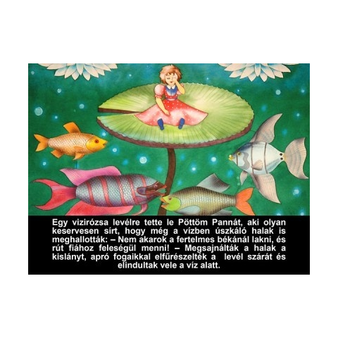 Írta: AndersenRajzolta: Neuberger GizellaMese egy apró leánykáról, aki nem akar a vakond felesége lenni. A fecske megszabadítja őt a vakond fogságából, és elrepíti egy virágos kertbe. Ott talál rá a pöttöm fiúra, akivel örök hűséget esküsznek egymásnak.