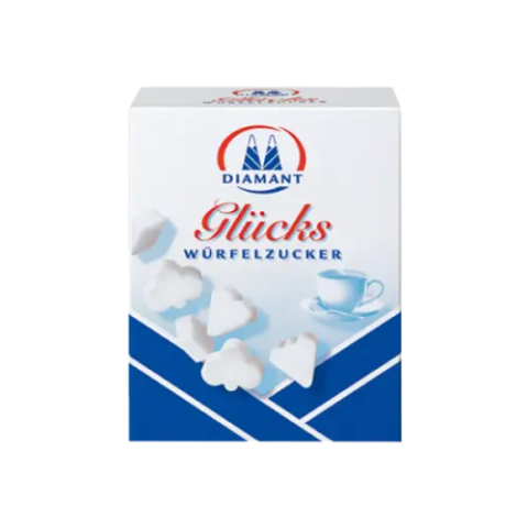 Az 500 g Diamant bridzs kockacukor a régi idők hangulatát idéző, a francia kártya négy jelét, treff, káró, kör, pikk alakokat formázó kockacukor.Átlagos tápérték 100 g termékben: 1700 kJ / 400 kcal