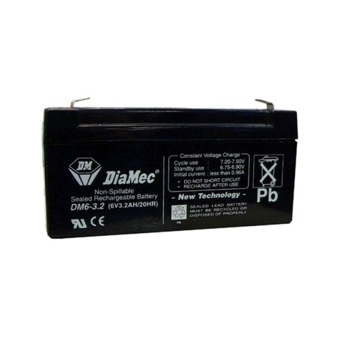 DIAMEC akkumulátor biztonságtechnikai rendszerekhez és elektromos játékokhoz, 6 V, 3,2 Ah, 125 x 33 x 60 mm 0,60 kg, normál tápegységekhez. – Hosszú élettartam, jó dinamikus viselkedés, gondozásmentes, teljesen zárt.