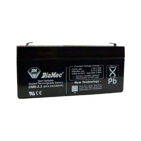 DIAMEC akkumulátor biztonságtechnikai rendszerekhez és elektromos játékokhoz, 6 V, 3,3 Ah, 134,5 x 35 x 60 mm 0,64 kg, normál tápegységekhez. – Hosszú élettartam, jó dinamikus viselkedés, gondozásmentes, teljesen zárt.