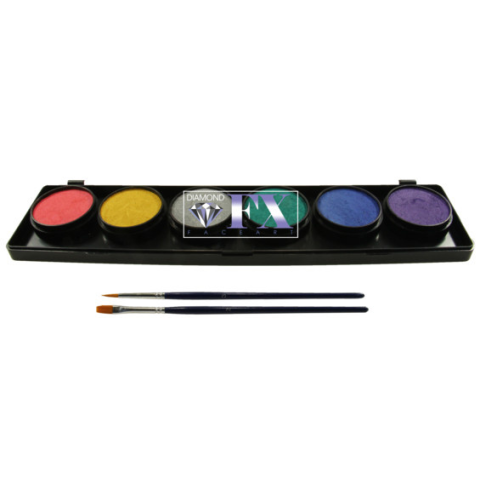 Diamond FX 6 színű arcfesték készlet - Metál színek 6 x 10 gramm Professzionális arc és testfesték készlet 6x10 gramm Metál színek, arcfestő ecsetekkel. Színek/színkódok, tartozékok: Metál arany, metál ezüst, metál rózsaszín, metál kék, metál zöld