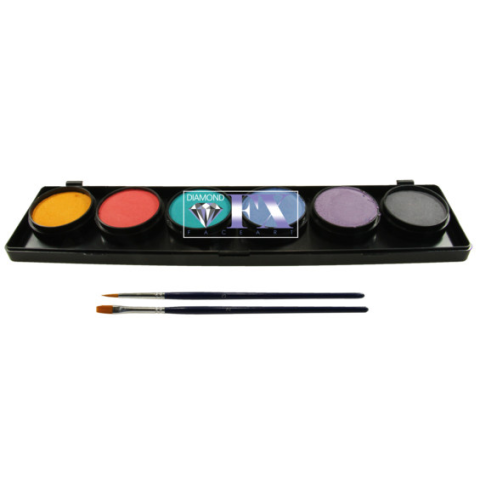 Diamond FX arcfesték - 6 Pasztell színű paletta Professzionális arc és testfesték készlet 6x10 gramm pasztell színek, arcfestő ecsetekkel. Színek/színkódok, tartozékok: Aranysárga, Fuxia, Tengerzöld, Pasztelkék, Szürke, Pasztel lila A paletta 1 d
